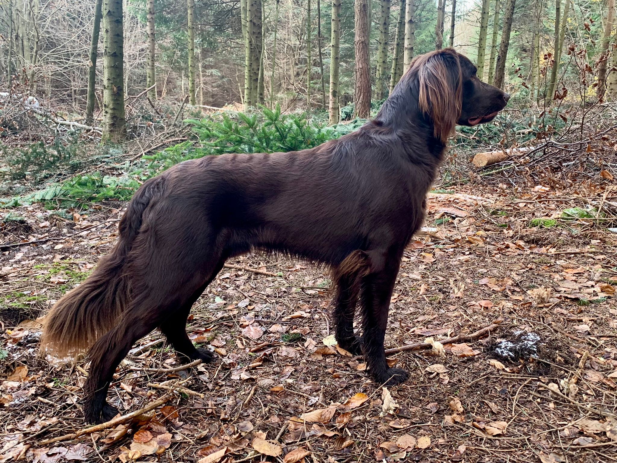Typvoller kräftiger Rüde des Mittelschlags, im Idealmaß stehend. Der Fang dürfte etwas massiver sein. Schöne Rückenlinie mit gut angesetzter Rute. Vorne weitgehend korrektes Gangwerk, hinten etwas steil stehend, ansonsten korrekt. Gut strukturiertes Gebrauchshaar auf der Kruppe etwas lockig, Behosung, Befahnung, Befransung ist sehr gut.